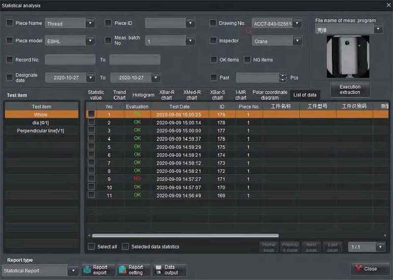 Los resultados de medición y sus principales parámetros estadísticos (media, σ, 3σ, 6σ, Ca, Cp, Cpk, etc.) se registran y almacenan automáticamente. Los operadores pueden realizar búsquedas según distintos criterios.